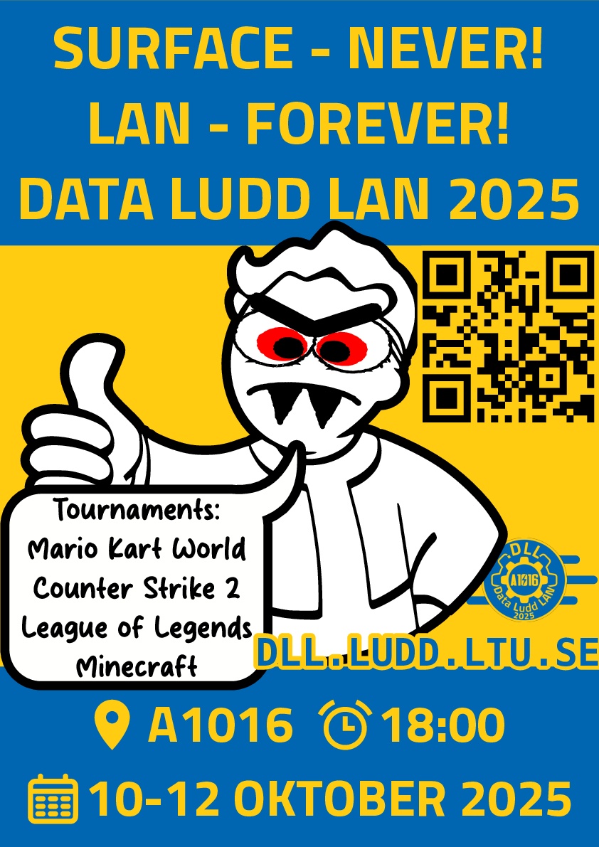 Welcome to DLL, LTU's autumn LAN-party! Get ready for a weekend of non-stop gaming, tournaments, and unforgettable fun. It will take place in the underground tentasal A1016, which we will call our home and bunker for the weekend!
