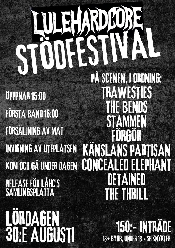 En halvdag full av musik med 8st band inom olika genrer, försäljning av mat, invigning av vår nysnickrade uteplats, release för Lulehardcores samlingsplatta, gött häng och annat sköj! Allt detta för ynka 150:- inträde. Ni kommer även få en markering så ni kan komma och gå under dagen om så önskas.