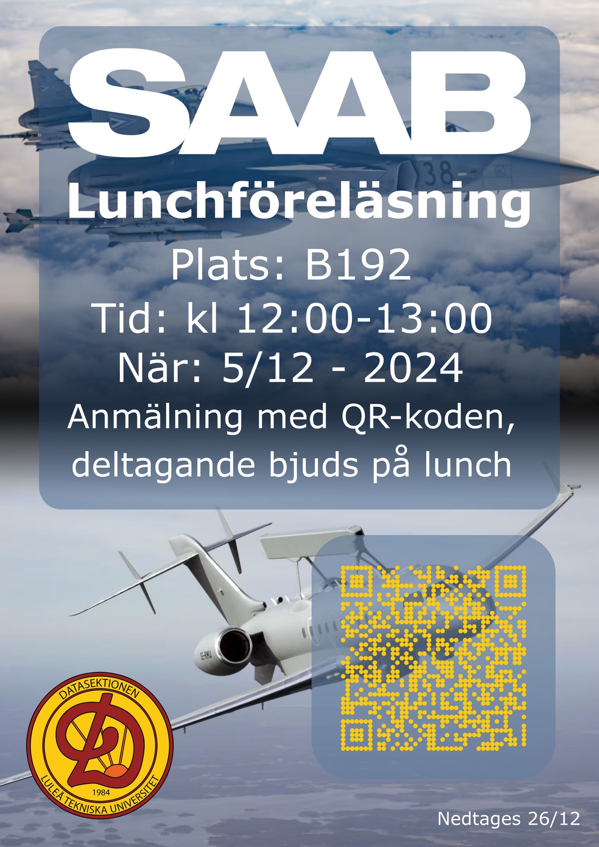 Den 5 December bjuder SAAB in till lunchföreläsning klockan 12-13 i B192. De berättar om deras verksamhet och vilka jobbmöjligheter det finns för studenter. Anmäl dig i länken nedan eller scanna QR-koden för att reservera din lunch!